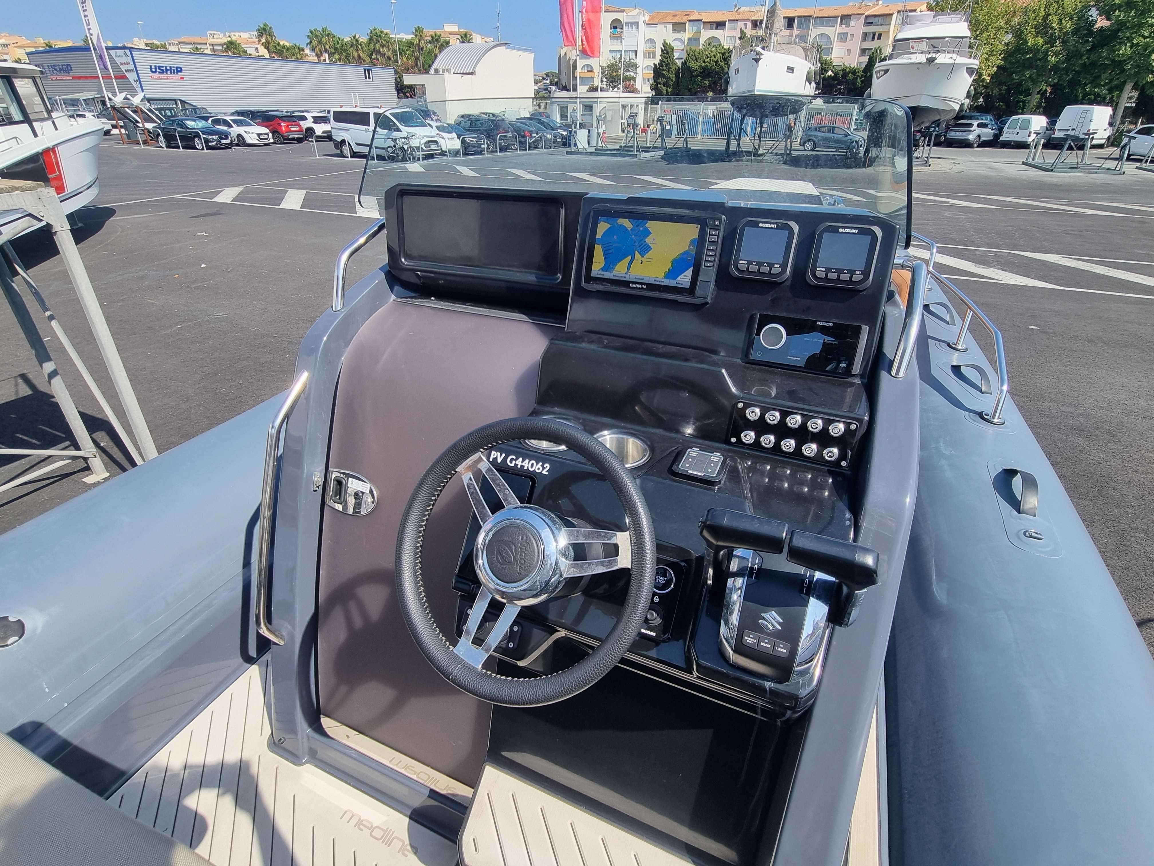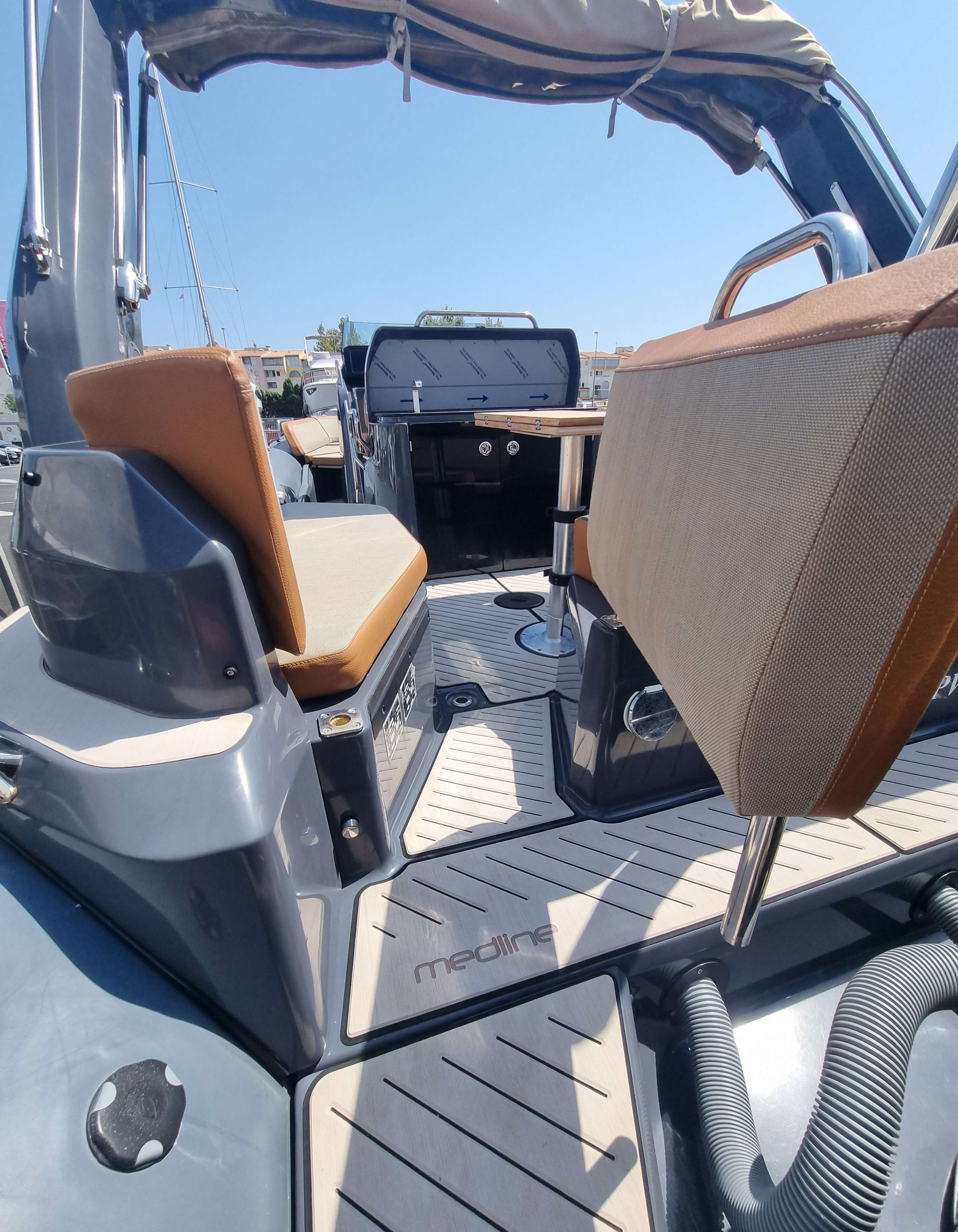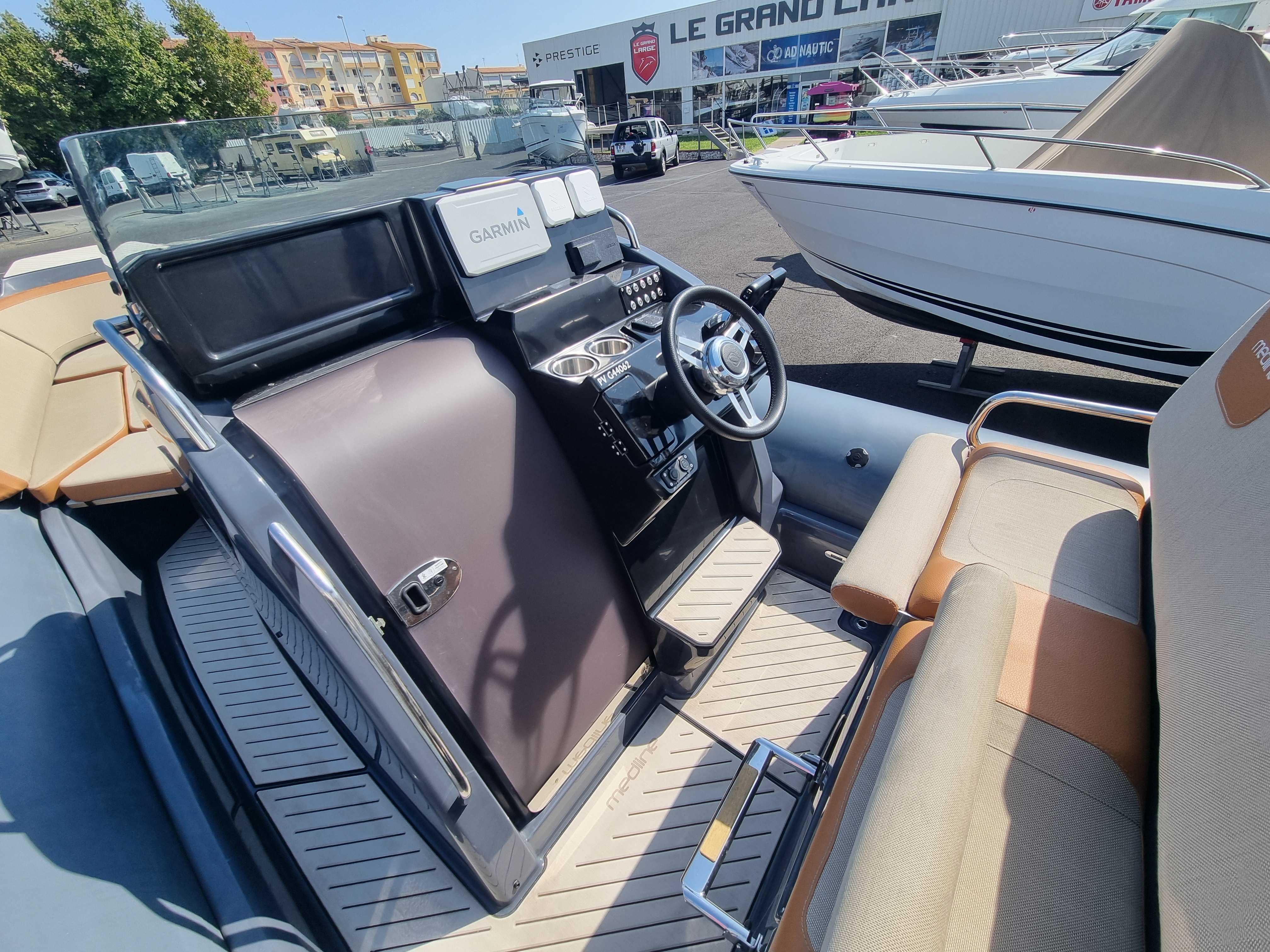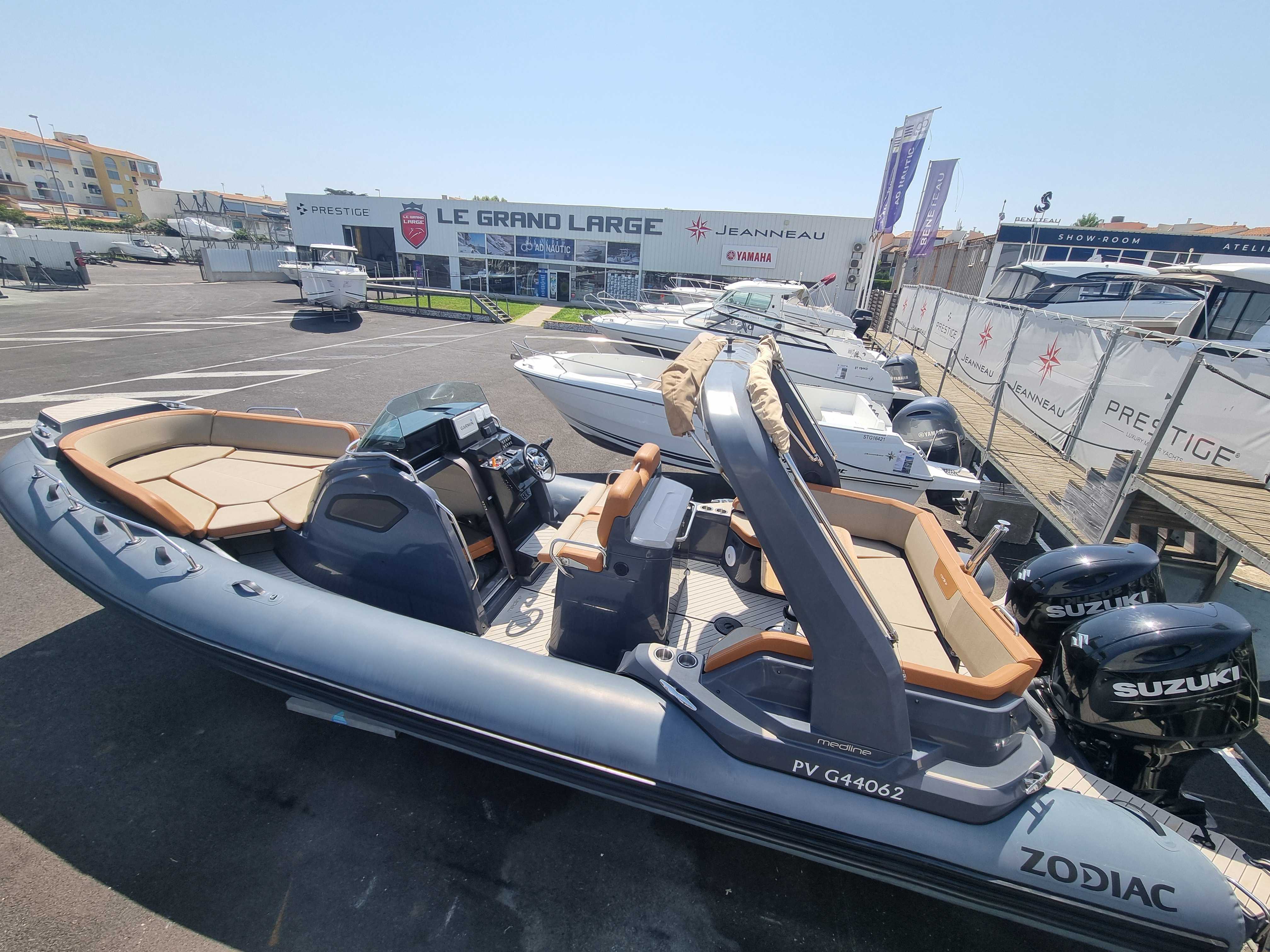 Le Zodiac Medline 9 est un semi-rigide haut de gamme, spécialement conçu pour des sorties en mer confortables et conviviales. Avec ses 9m de long, il offre un espace opimisé pour la détente, incluant un grand bain de soleil à l’avant et un espace de vie spacieux à l’arrière. Avec ses deux moteurs, il garantit une navigation rapide et stable, l’idéal pour les sports nautiques ou les sorties en famille.